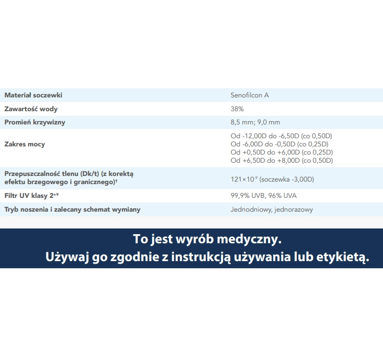 Контактные линзы и растворы для их ухода являются медицинскими изделиями, в основном класса IIa, в соответствии с требованиями Регламента (ЕС) 2017/745 Европейского Парламента и Совета (MDR), а также Закона от 7 апреля 2022 г. поз. 974). Перед применением рекомендуется проконсультироваться со специалистом по уходу за зрением и следовать указаниям в инструкции.