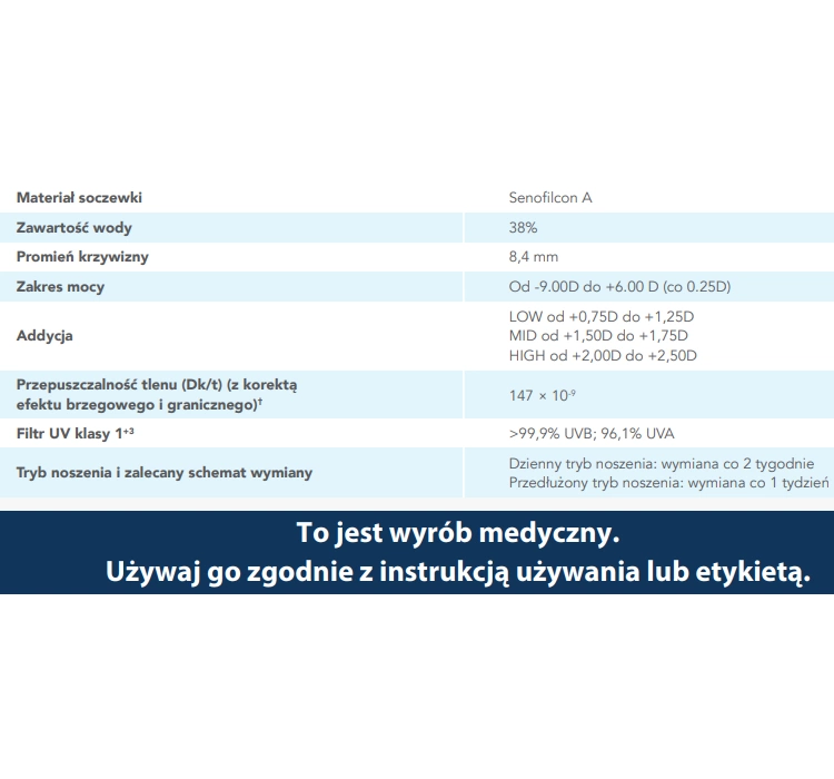 Контактные линзы и растворы для их ухода являются медицинскими изделиями, в основном класса IIa, в соответствии с требованиями Регламента (ЕС) 2017/745 Европейского Парламента и Совета (MDR), а также Закона от 7 апреля 2022 г. поз. 974). Перед применением рекомендуется проконсультироваться со специалистом по уходу за зрением и следовать указаниям в инструкции.