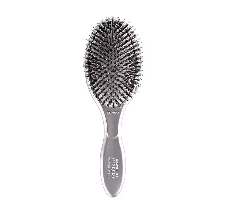 Щетка Ceramic + Ion Supreme Combo имеет нейлоновую щетину, смешанную с щетиной кабана. Эта комбинация придает волосам блеск и объем, а также уменьшает их пушистость.