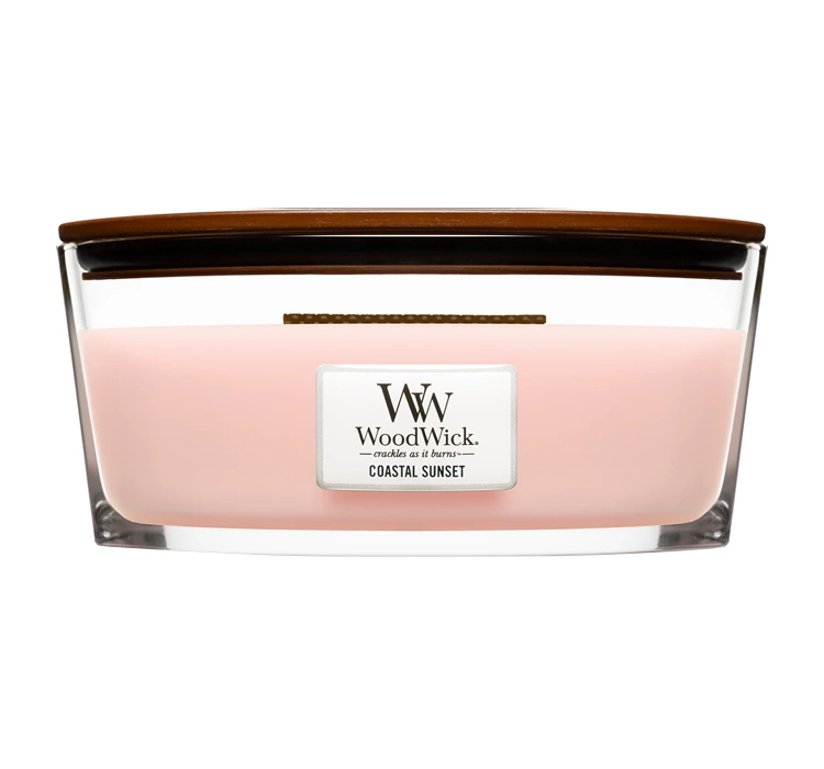 WoodWick Ellipse Candle Coastal Sunset – это тропический аромат кокоса и цветов, приправленный океанским бризом.
