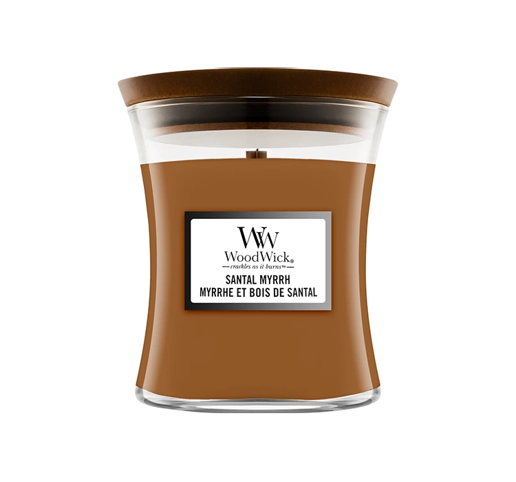 Ароматическая свеча WoodWick Hourglass Jar Candle Santal Myrrh окутывает пространство теплым древесным ароматом красного дерева и смолистого мирры, который приобретает исключительную глубину благодаря золотистой амбре и кремовому сандаловому дереву. Тонкая сладость ванили и кокоса гармонирует с бальзамическим маслом Элеми, а все оживляется свежим лимоном и нежно травяным эвкалиптом. Аромат изыскан, обволакивающий и полон контрастов – он сочетает теплые акценты ладана со свежей цитрусовой нотой, создавая атмосферу отдыха и элегантности.