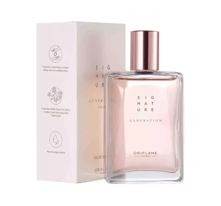 Уникальный аромат Oriflame Signature Generation For Her состоит из насыщенного букета белых цветов, оставляя на коже теплый, чувственный шлейф. Композиция была создана мастером-парфюмером Оливье Креспом и его сыном, парфюмером Себастьеном Креспом.