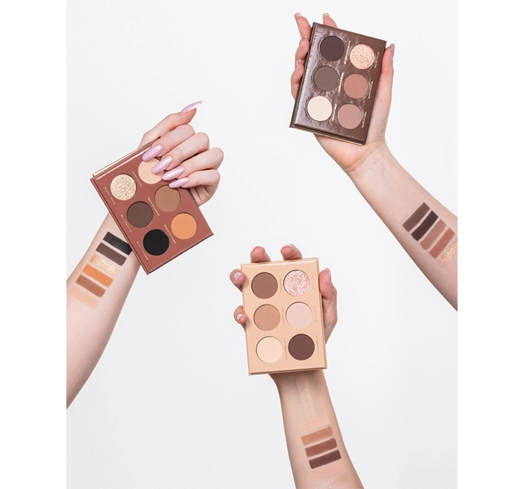 В палитре — шесть идеально подобранных оттенков: пять матовых и один мерцающий топер. Такая комбинация позволяет легко менять настроение макияжа – от легкого дневного до глубокого вечернего. Теплые коричневые, карамельные и бежевые тона прекрасно сочетаются между собой, придавая взгляд глубины и выразительности.