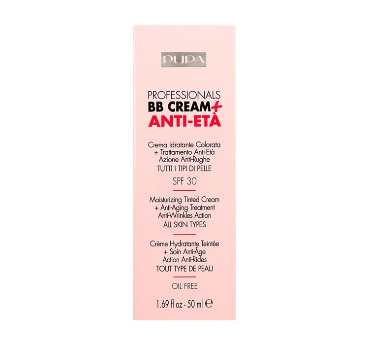 Pupa Professionals BB Cream + Anti Eta SPF 30 - это BB крем с антивозрастным действием. Тонкие линии и морщины становятся заметно разглаженными, а лицо кажется более гладким. Подходит для любого типа кожи. Обезжиренная формула. Имеет фильтр SPF 30.