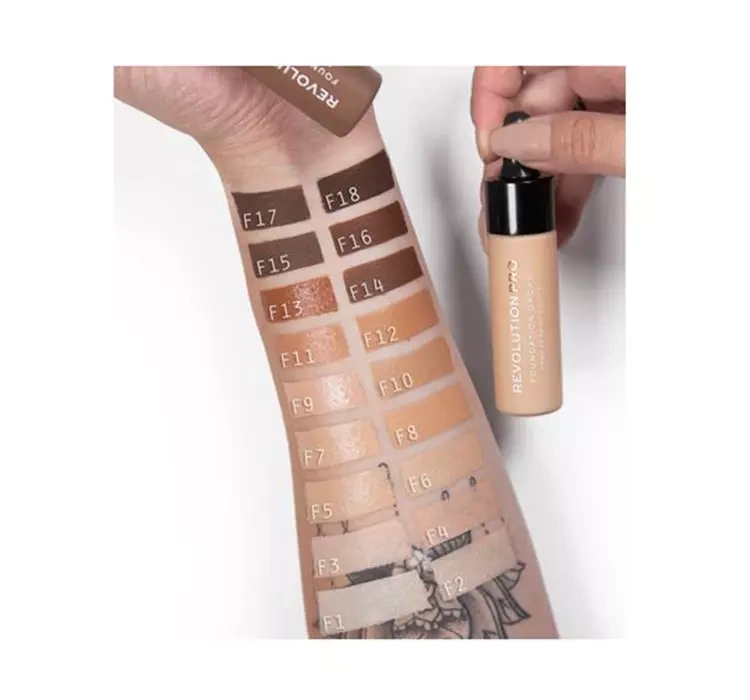 Широкая цветовая палитра Revolution Pro Foundation Drops позволяет идеально подобрать оттенок к естественному тону кожи или же к желаемому оттенку. Каждый цвет начинается с буквы F, за которой следует соответствующее число в диапазоне от 0,5 до 18. Это означает, что Вы можете выбрать вариант из 19 отдельных предложений! Цифры расположены в хронологическом порядке, чем большее число, тем темнее будет тональный крем и тем лучше он будет соответствовать потребностям загорелых или темнокожих лиц.