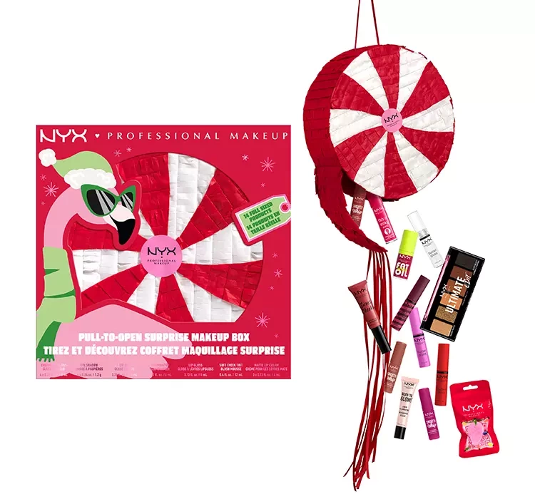 Вы готовы к рождественским сюрпризам? Откройте для себя подарочный набор косметики в форме пиньяты из коллекции NYX Professional Makeup Fa La La L.A. Land. Набор косметики Piniata Pull To Sleigh наполнен увлекательными средствами для макияжа! Просто возьмите или повесьте пиньяту и потяните за ниточки, открывая таким образом 14 бестселлеров от NYX Professional Makeup.