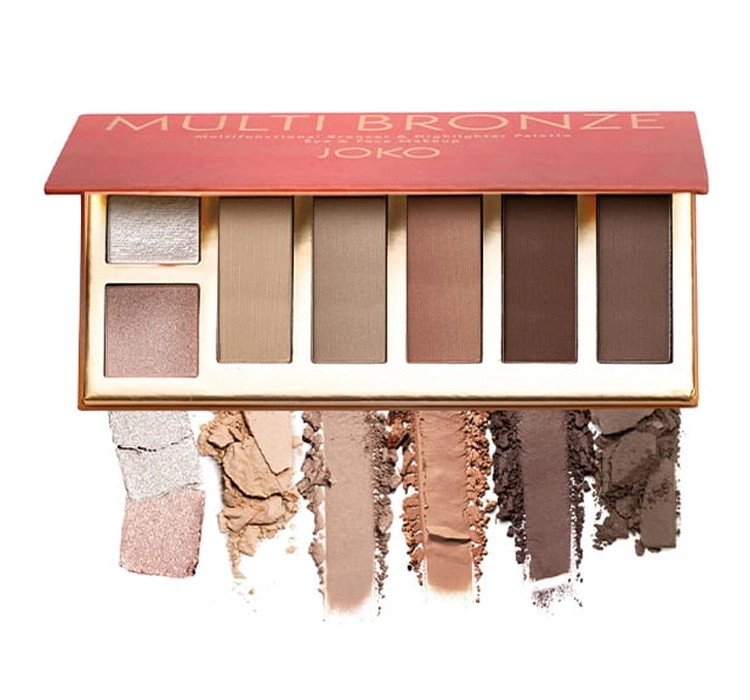 Бархатистый бронзер с лёгкой текстурой идеально сливается с кожей, моделируя черты лица и создавая эффект естественного загара без разводов и пятен. Хайлайтер Joko Multi Bronze подчёркивает сияние кожи, создавая финишное покрытие, интенсивность которого можно варьировать — от лёгкого блеска до яркого свечения. В то же время шёлковисто-гладкие тени для век обеспечивают лёгкость растушёвки и стойкость, оставаясь на веках в течение многих часов. Формула палетки чрезвычайно лёгкая и приятная в нанесении, что делает каждый макияж свежим и гармоничным.