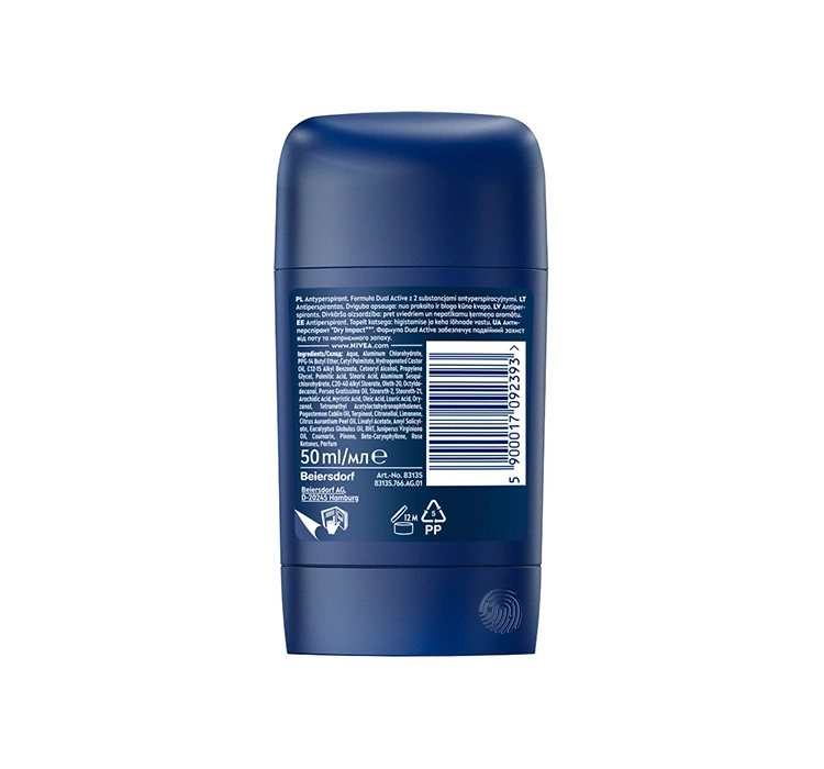 Антиперспирант-стик NIVEA MEN Dry Impact – средство, обеспечивающее эффективную и надежную защиту от потоотделения. Благодаря формуле Dual Protect антиперспирант обеспечивает надежную защиту в течение 48 часов, ухаживая за кожей под мышками. Средство обладает свежим ароматом, его формула быстро высыхает на коже и не создает ощущение липкости. Формула нежная к коже – продукт не содержит этилового спирта. Откройте для себя современную упаковку, разработанную для более интуитивно понятного использования и дополнительно предлагает на 25% больше содержимого продукта. Переносимость кожей подтверждена дерматологически.