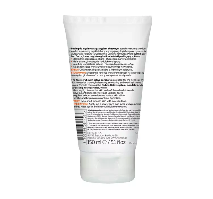 Пилинг для лица из серии AA Men Carbon Care тщательно очищает лицо от всех загрязнений и отшелушивает мертвые клетки эпидермиса. Идеально выравнивает тон кожи и разглаживает ее. Кроме того, пилинг эффективно раскрывает поры и регулирует количество выделенного кожного сала. Обладает антибактериальными, успокаивающими и увлажняющими свойствами. В составе косметики Вы найдете систему Carbon Detox, миндальную кислоту и микрочастицы пилинга.
