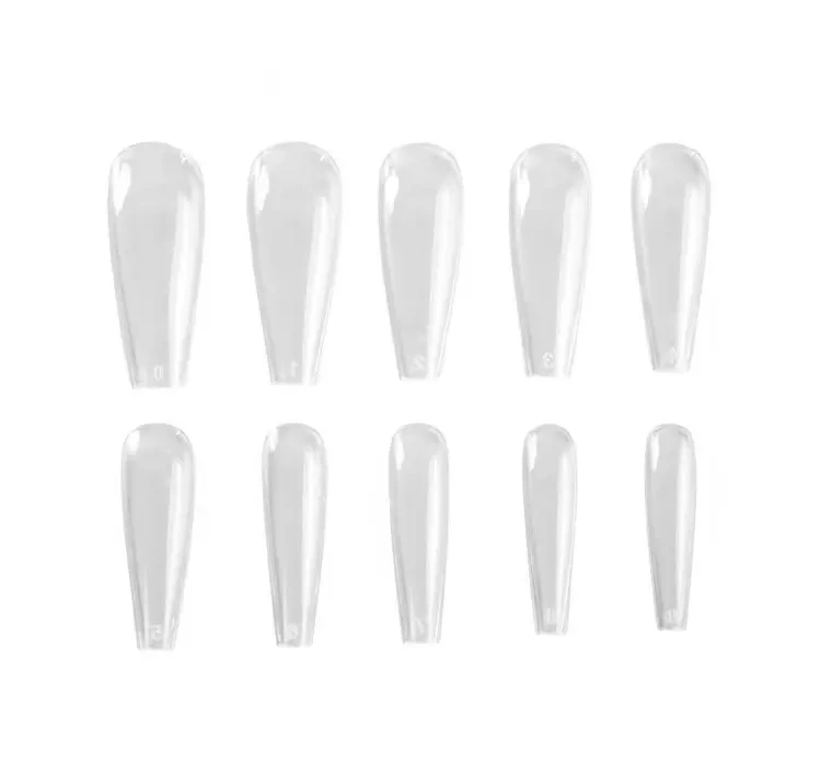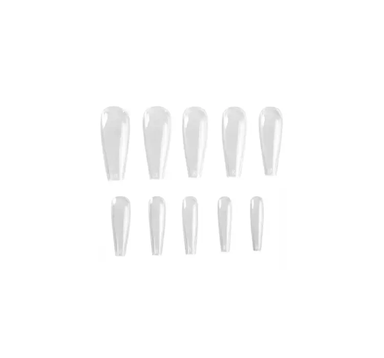 В набор входит 500 штук прозрачных типсов 11 размеров. Типсы имеют прямую линию – форму ballerina. Продукт идеально приспосабливается к ногтевой пластине, а благодаря изгибу в соответствии с ростом ногтя обеспечивает натуральный вид.