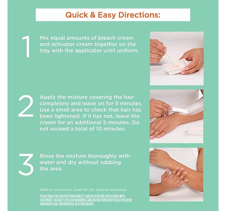 ВНИМАНИЕ! Если во время осветления вы заметили раздражение кожи, смесь при помощи шпателя уберите обратно в чашку. Добавьте больше отбеливающего крема (Creme Hair Bleach), перемешайте и повторно нанесите. Если раздражение не исчезает, смойте все холодной водой и повторите процедуру через сутки.