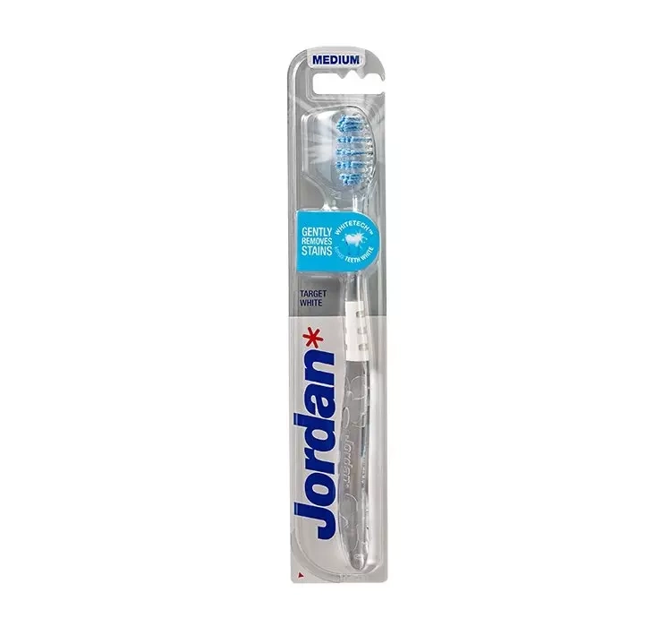 Jordan Target White эффективно устраняет пятна, оставляя зубы естественно белыми. Характеризуется дополнительными синими, более твердыми щетинками, которые помогают устранить пятна, вызванные употреблением кофе или чая. Благодаря чему, зубы сохраняют прекрасный, естественно белый вид.