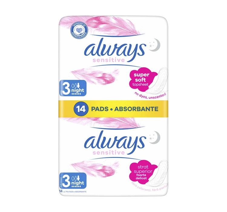 Гигиенические прокладки Always тонкие, толщиной всего 3 мм, но в то же время очень хорошо впитывают, невероятно удобны и практически незаметны при ношении. Гигиенические прокладки Always Sensitive размера 3 Night являются наиболее поглощающими из всех гигиенических прокладок Sensitive. Они будут защищать вас всю ночь.