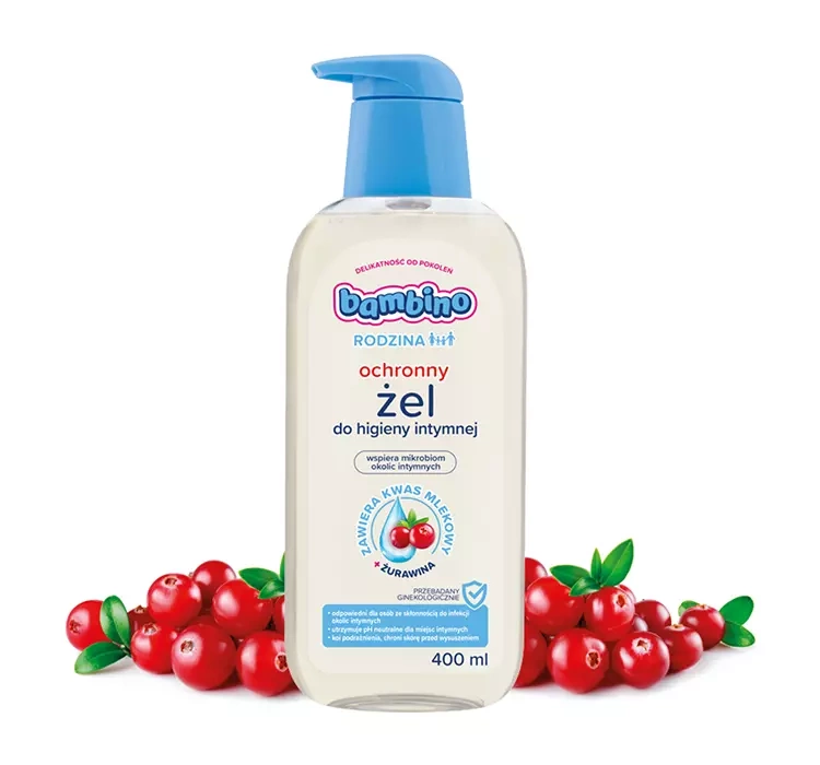 Bambino Rodzina гель для интимной гигиены - это мягкое косметическое средство для ежедневного ухода. Формула косметического средства обогащена экстрактом клюквы, молочной кислоты, лактатом натрия и аллантоином.