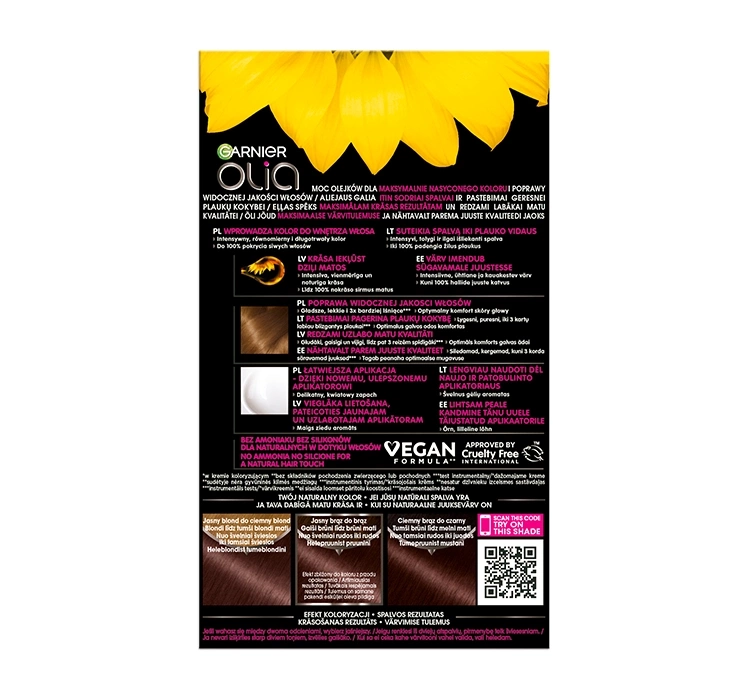 Garnier Olia - это полная палитра стойких красок для волос. Уникальная формула красок содержит до 60 процентов натуральных цветочных масел, которые способствуют проникновению цветов и гарантируют насыщенный, яркий оттенок.