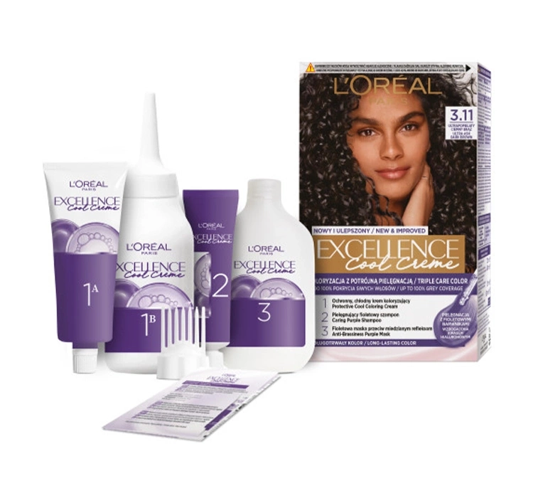 Линия холодных оттенков L'Oréal Paris Excellence Cool Creme покрывает седину на 100% и предотвращает медные блики. Крем-краска обогащена прокератином и активной сывороткой, которая защищает волосы во время окрашивания и обеспечивает длительный цвет. Фиолетовый шампунь после окрашивания с мягким pH очищает кожу головы и волосы от остатков краски и разглаживает волосы, чтобы придать им блеск. Фиолетовая маска питает пряди и нейтрализует медные блики.