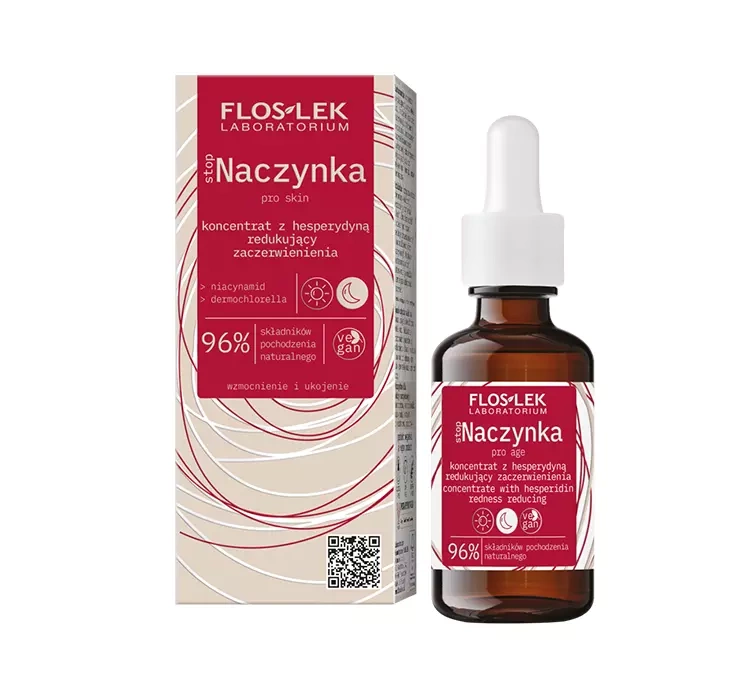 Концентрат с гесперидином Floslek stopVillages уменьшает покраснение на лице, шее и декольте. Эффективно уменьшает видимость расширенных кровеносных сосудов, также при периодической гиперактивности, появляющейся под влиянием, например сильных эмоций или резких перепадов температуры. Сыворотка для куперозной кожи создана на 96% из ингредиентов, полученных от природы. В его состав входят: гесперидин, экстракт каштана, ниацинамид и дермохлорелла, которая участвует в синтезе коллагена. Концентрат восстанавливает равномерный цвет, ярко освещает тени и успокаивает усталую кожу. При регулярном применении вы заметите понижение чувствительности и покраснения на лице.