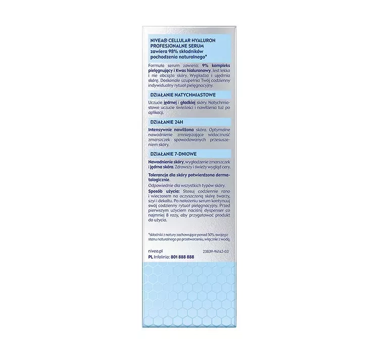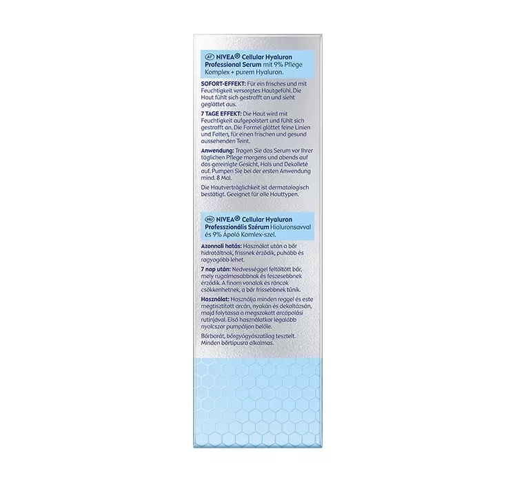 Nivea Cellular – это серия средств по уходу за зрелой кожей всех типов. Она была создана для восстановления должного уровня увлажнения, гладкости и упругости. Профессиональная гиалуроновая сыворотка для лица содержит 9% комплекса по уходу, подкрепленного гиалуроновой кислотой в ее самом чистом виде. В результате лучше усваивается и достигает глубоких слоев эпидермиса. Довольно всего 7 дней регулярного использования сыворотки Nivea Cellular Hyaluron - утром и вечером, и Вы заметите впечатляющие эффекты.