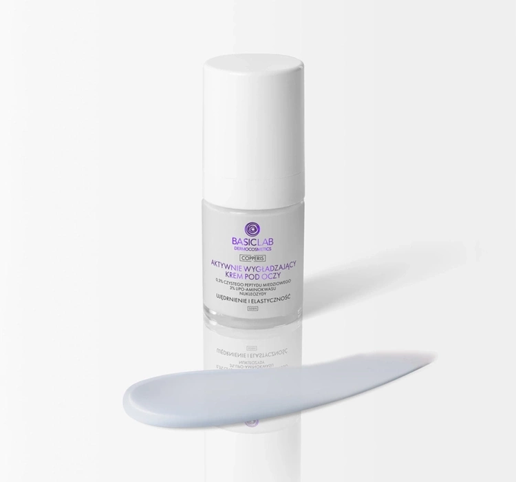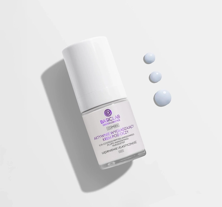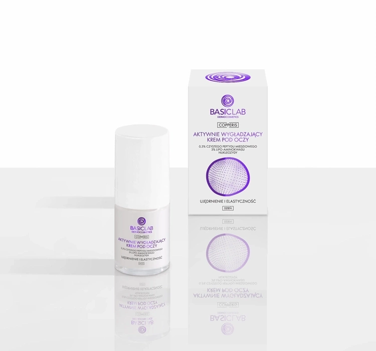Формула крема для глаз BasicLab Copperis основана на тщательно подобранных активных ингредиентах с доказанной эффективностью. Содержание 0,3% чистого медного пептида стимулирует выработку коллагена, эластина и гликозаминогликанов, благодаря чему кожа становится более упругой и эластичной. Этот компонент поддерживает процессы восстановления, укрепляет кожный барьер и заметно уменьшает глубину и длину морщин. Дополнительно 3% липо-аминокислоты, то есть липофильного производного гидроксипролина, улучшает эластичность кожи и защищает эластиновые волокна от разрушения, вызванного UV-лучами. Нуклеозиды, такие как аденозин и уридин, снабжают клетки энергией, ускоряют регенерацию и поддерживают оптимальное увлажнение, делая кожу более гладкой и отдохнувшей.