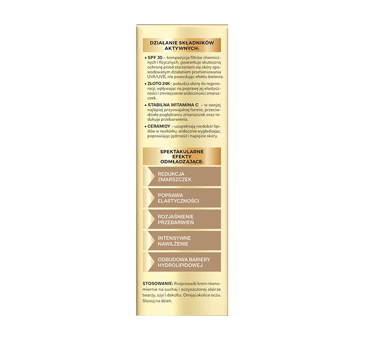 Ingredients: Aqua, Dibutyl Adipate, Methylene Bis-Benzotriazolyl Tetramethylbutylphenol (Nano), Polyglyceryl-6 Stearate, Glycerin, Coco-Caprylate/Caprate, Dicaprylyl Carbonate, Diethylamino Hydroxybenzoyl Hexyl Benzoate, Ethylhexyl Triazone, Triethylhexanoin, Pentylene Glycol, Squalane, Potassium Cetyl Phosphate, Cetearyl Alcohol, Tocopheryl Acetate, Bixa Orellana Seed Oil, Oenothera Biennis Oil, Rosa Canina Fruit Oil, Helianthus Annuus Seed Oil, Ceramide NG, Oryza Sativa Bran Oil, Calendula Officinalis Flower Extract, Borago Officinalis Seed Oil, Acetyl Dipeptide-1 Cetyl Ester, Gold, Ceramide NP, Hyaluronic Acid, Triolein, Glyceryl, Panthenol, Sodium Hydroxide, Allantoin, Acetyl Heptapeptide-9, Nicotiana Benthamiana Hexapeptide-40 Sh-Polypeptide-76,Polyglyceryl-6 Behenate, Ethylhexyl Stearate, Myristyl Myristate, Cetyl Hydroxyethylcellulose, Glycine Soja Oil, Glyceryl Behenate, Hydrogenated Palm Oil, Maltodextrin, Glyceryl Behenate, Hydrogenated Palm Oil, Glyceryl Stearate Citrate, Cholesterol, Dioleate, Sorbitan Laurate, Oryza Sativa Powder, Hydroxyethylcellulose, Propylene Glycol, Butylene Glycol, Decyl Glucoside, Glyceryl Sodium Polyacrylate, Xanthan Gum, Trideceth-6, Acrylate/Acrylic Acid Copolymer, Tocopherol, Sodium Benzoate, Potassium Sorbate, Hydroxyacetophenone, Phenoxyethanol, Ethylhexylglycerin, Parfum.