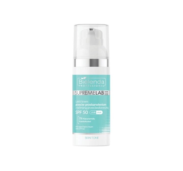 Крем для лица против пигментных пятен с SPF50 Bielenda Professional Skin Tone — это инновационное средство, сочетающее мощный солнцезащитный фильтр SPF50 с активным действием против пигментации. Благодаря сочетанию 5% ниацинамида и ксантогумола крем эффективно уменьшает видимость пигментных пятен, выравнивает тон кожи и защищает ее от окислительного стресса — одного из факторов появления новой пигментации.