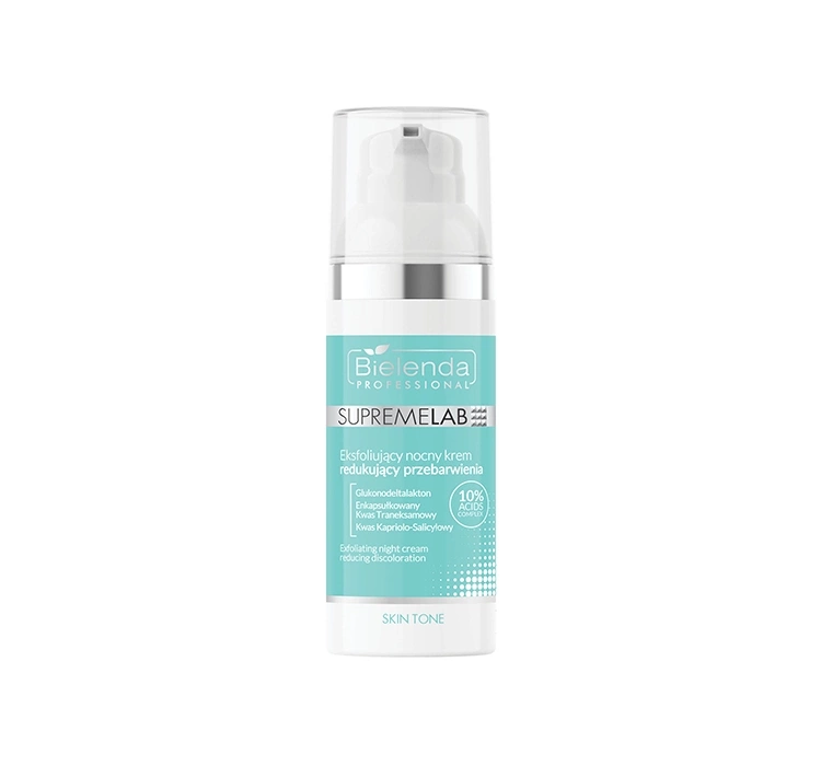 Bielenda Professional Skin Tone Exfoliating Night Cream Reducing Discoloration – это инновационный ночной крем, разработанный для выравнивания тона кожи и уменьшения пигментации. Благодаря 10% кислотному комплексу, в состав которого входят глюконодельталактон, инкапсулированная транексамовая кислота и каприловая/салициловая кислота, средство мягко отшелушивает ороговевшие клетки, выравнивает цвет лица и уменьшает видимость пигментных пятен.