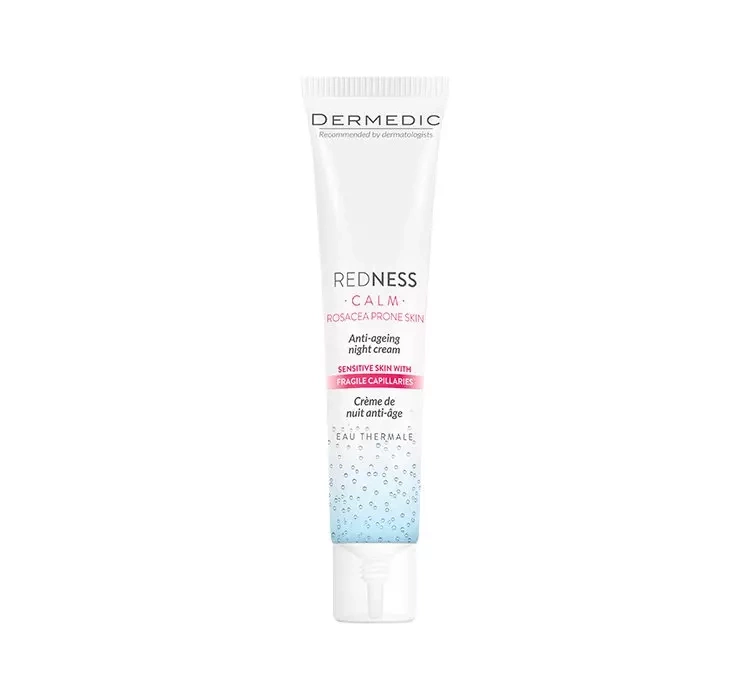 Крем от морщин на ночь Dermedic Redness Calm - уникальное косметическое средство, которое глубоко увлажняет, питает, стимулирует регенерацию и эффективно ухаживает за чувствительной куперозной кожей. Инновационная формула косметического средства успокаивает все раздражения и покраснения, улучшая таким образом состояние и внешний вид. Комплекс Rosashield пополняет витамины и микроэлементы, благодаря чему кожа восстанавливает свой баланс и становится менее восприимчивой к негативному воздействию внешних факторов или окислительному стрессу, отвечающему за ускоренное старение. Более того, косметическое средство уменьшает отеки, ощущение напряжения и склонность кровеносных сосудов к расширению. Это косметическое средство является гипоаллергенным с термальной водой и некомедогенным.
