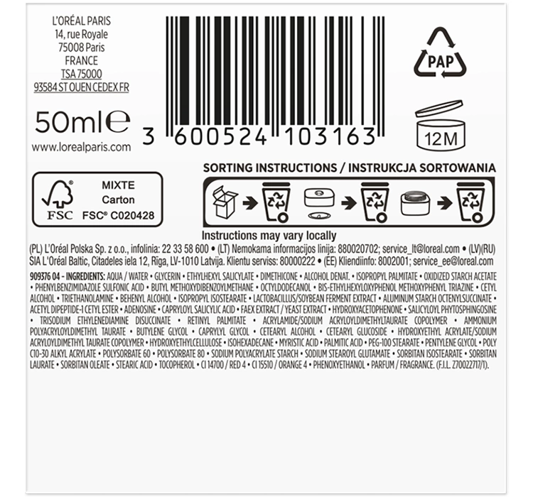 Ingredients: Aqua / Water, Glycerin, Ethylhexyl Salicylate, Dimethicone, Alcohol Denat., Isopropyl Palmitate, Oxidized Starch Acetate, Phenylbenzimidazole Sulfonic Acid, Butyl Methoxydibenzoylmethane, Octyldodecanol, Bis-Ethylhexyloxyphenol Methoxyphenyl Triazine, Cetyl Alcohol, Triethanolamine, Behenyl Alcohol, Isopropyl Isostearate, Lactobacillus/Soybean Ferment Extract, Aluminum Starch Octenylsuccinate, Acetyl Dipeptide-1cetyl Ester, Adenosine, Capryloyl Salicylic Acid, Faex Extract / Yeast Extract, Hydroxyacetophenone, Salicyloyl Phytosphingosine, Trisodium Ethylenediamine Disuccinate, Retinyl Palmitate, Acrylamide/Sodium Acryloyldimethyltaurate Copolymer, Ammonium Polyacryloyldimethyl Taurate, Butylene Glycol, Caprylyl Glycol, Cetearyl Alcohol, Cetearyl Glucoside, Hydroxyethyl Acrylate/Sodium Acryloyldimethyl Taurate Copolymer, Hydroxyethylcellulose, Isohexadecane, Myristic Acid, Palmitic Acid, PEG-100 Stearate, Pentylene Glycol, Poly C10-30 Alkyl Acrylate, Polysorbate 60, Polysorbate 80, Sodium Polyacrylate Starch, Sodium Stearoyl Glutamate, Sorbitan Isostearate, Sorbitan Laurate, Sorbitan Oleate, Stearic Acid, Tocopherol, Cl 14700 / Red 4, CI 15510 / Orange 4, Phenoxyethanol, Parfum / Fragrance. (F.I.L. Z70022717/1).
