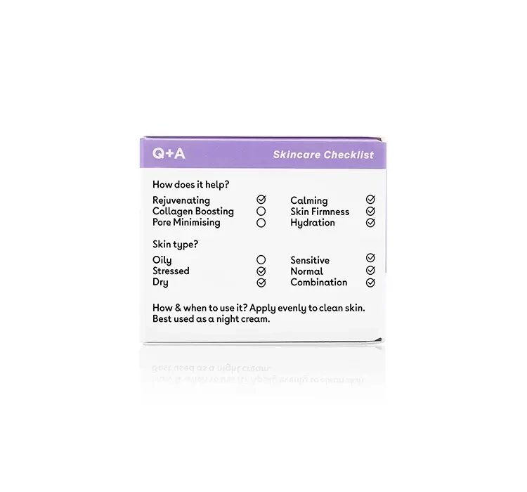 Успокаивающий ночной крем Q+A Chamomile Calming имеет приятную кремовую текстуру, поэтому идеально подходит для использования в качестве комплексного восстанавливающего ночного ухода. В частности, рекомендуется для сухой, усталой и тусклой кожи, подвергающейся антиоксидантному стрессу. Крем Q+A Chamomile очень эффективен благодаря содержанию успокаивающего экстракта ромашки, смягчающих масел: виноградных косточек и жожоба, а также кремового масла ши. Вместе они успокаивают раздражение и покраснение кожи и уменьшают воспаление, благодаря чему лицо становится свежим и отдохнувшим после пробуждения.