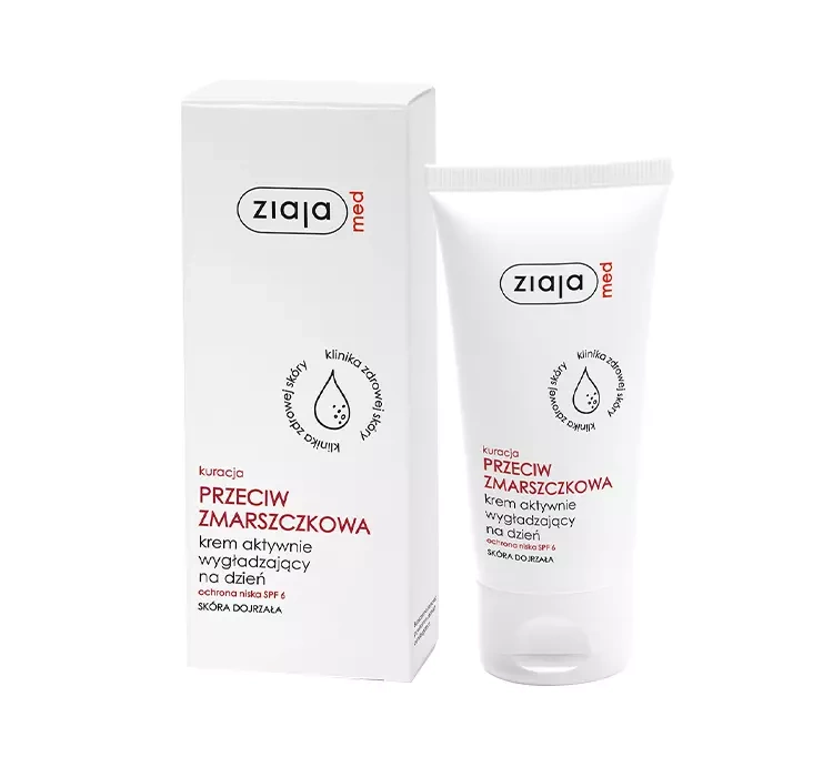 Крем на день Ziaja Med - Уход против морщин с фильтром SPF 6 предназначен для зрелой, с морщинами кожи, которая нуждается в разглаживании и эластичности. Он очень деликатный к химическому балансу эпидермиса, уменьшает морщины и восстанавливает упругость кожи. Интенсивно увлажняет и питает, укрепляя коллагеновые волокна. Не содержит ароматизаторов.