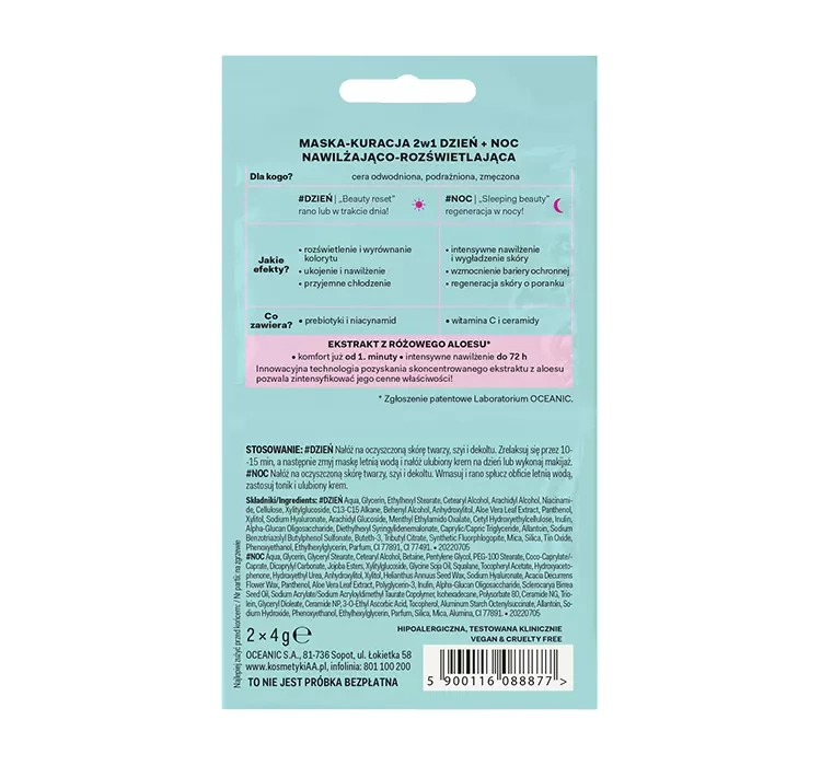 Увлажняюще-осветляющая маска-уход 2in1AA Pink Aloe - это двухэтапная программа по уходу за всеми типами кожи, особенно обезвоженной, раздраженной и уставшей. У саше две маски – на ночь и на день.