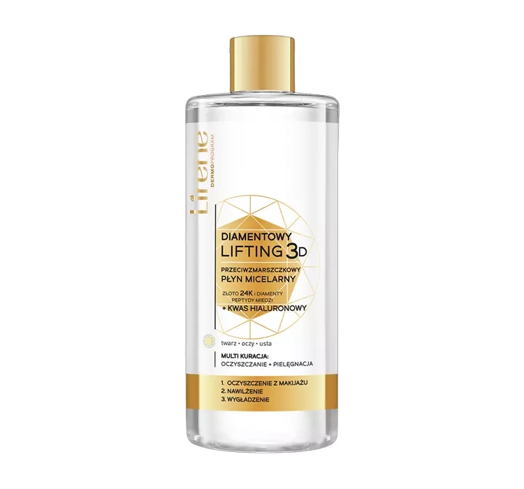 Мицеллярная жидкость против морщин Lirene Diamond Lifting 3D тщательно очищает кожу от макияжа и загрязнений. Не сушит и предотвращает раздражение, которое может возникнуть во время очищения. Мицеллярный флюид обеспечивает коже гладкость, мягкость и достаточное увлажнение. Формула косметического средства обогащена такими ингредиентами, как:сочетание 24-каратного золота и бриллиантов, что уменьшает и предотвращает образование морщин, повышает упругость и эластичность кожи и поддерживает синтез коллагена;
