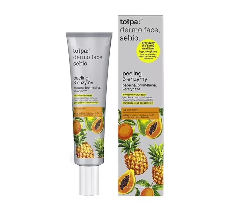 Tołpa dermo face sebio peeling 3 ферменты - это продукт, который действует как пилинг, благодаря трем ферментам удаляет ороговевший эпидермис - без потирания и раздражения, поскольку не содержит частиц и кислот AHA.