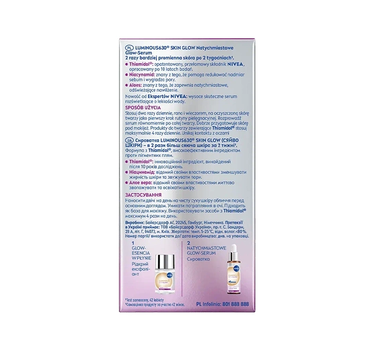 Сыворотка NIVEA LUMINOUS630® SKIN GLOW — инновационное средство, работающее на трех уровнях, постепенно восстанавливая природное сияние кожи. Благодаря мощному комплексу с Thiamidol®, ниацинамидом и алоэ вера сыворотка эффективно выравнивает тон кожи, сужает поры и обеспечивает глубокое увлажнение.