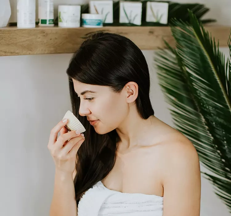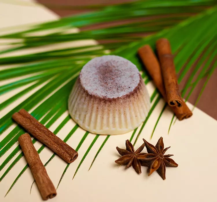 100% натуральный бальзам для тела в твердом виде, без содержания воды. Изготовлен из масла кокум, какао-масла, пчелиного воска, растительных масел, в том числе жасминового, и экстракта зеленого чая. Все компоненты натуральные, холодного отжима, нерафинированные, не поддавались механической обработке. Брикет не плавится под воздействием температуры тела. Бальзам лучше всего применять после купания, когда кожа распаренная и легко может его впитать. Кожа после массажа бальзамом в брикете становится невероятно гладкой. Масло корицы оказывает разогревающее и утягивающее действие, придавая коже упругость, благодаря чему помогает смоделировать красивые формы. Улучшает также цвет уставшей кожи и устраняет токсины. Масло пачули имеет успокаивающие, антидепрессантные, освежающие и увлажняющие свойства.