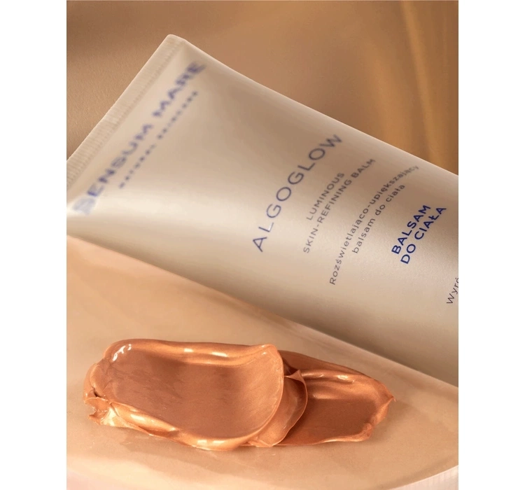 Sensum Mare Algoglow Luminous Skin-Refining Balm — уникальный сияющий бальзам для тела, дающий коже эффект мягкого золотистого сияния „golden hour”. Деликатно выравнивает тон, придает коже естественный блеск, маскирует мелкие недостатки и создает эффект легкого, здорового загара. Шелковистая текстура легко распределяется, быстро впитывается, не оставляя пятен и следов на одежде — идеальный выбор перед выходом из дома.