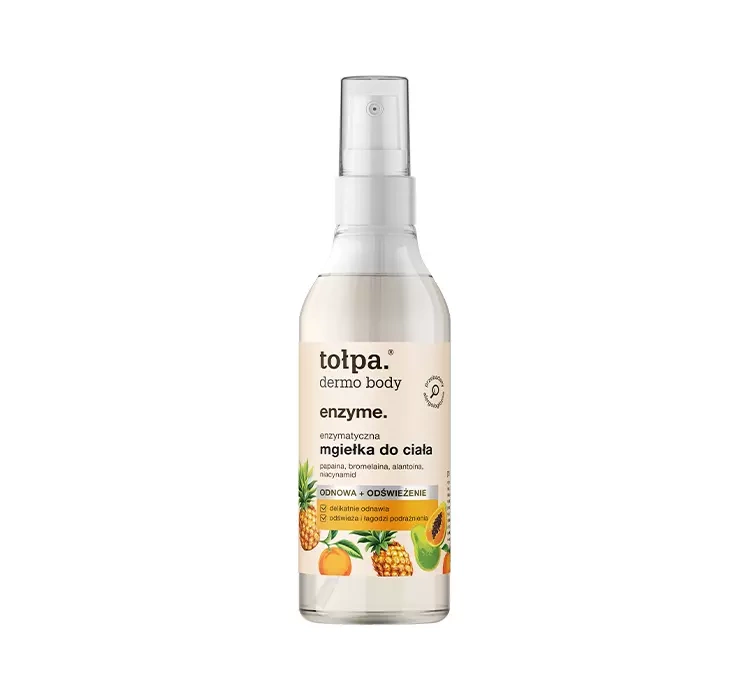 Энзимный спрей для тела tołpa dermo body enzyme уменьшает недостатки и изменения цвета на теле, а также предотвращает их повторное появление. Кроме того, мгновенно освежает, снимает раздражение и устраняет красноту. В состав спрея для тела входят, среди прочего, бромелаин и папаин. Бромелаин получают из плодов ананаса. Этот компонент обладает осветляющим эффектом, уменьшает шероховатость кожи и придает ей здоровый цвет. Папаин - фермент из плодов папайи, который регенерирует и восстанавливает кожу. Обладает антиоксидантными и противовоспалительными свойствами. Эти компоненты взаимно усиливают свое действие, благодаря чему спрей для тела чрезвычайно эффективен.