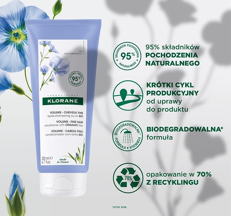 Кондиционер с органическим леном – лучший способ утолщать тонкие волосы, а также решить проблемы с их укладкой. Для лучших результатов необходимо использовать кондиционер с другими продуктами из линии Klorane Volume. Большим преимуществом нашего кондиционера является его биологически раскладная формула и тот факт, что упаковка была изготовлена из переработанных материалов.