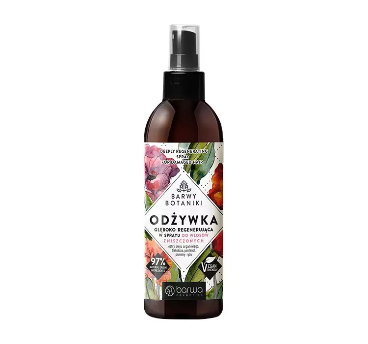 Глубоко восстанавливающий спрей-кондиционер Barwa Barwy Botaniki имеет мягкую формулу, которая не отягощает кожу головы и не вызывает ее пересыхания. В его состав входят гидролизованный шелк, протеины пшеницы, трегалоза и пантенол, которые восстанавливают ослабленные пряди, ограничивают их ломкость и снижают склонность к чрезмерному выпадению. Не смывающийся кондиционер содержит аж 97% ингредиентов натурального происхождения и является на 100% веганским.