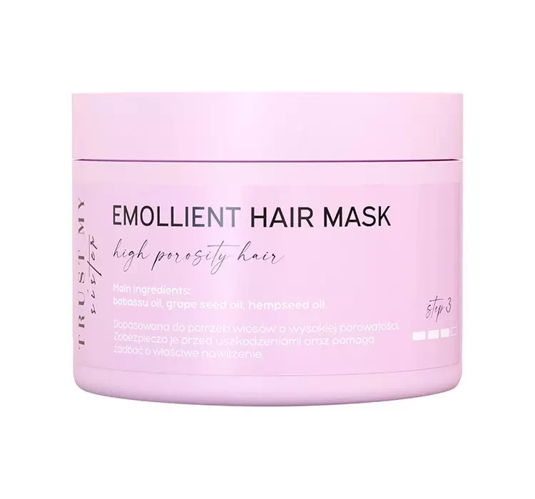 Смягчающая маска для волос Trust My Sister с высокой пористостью в своей формуле содержит восстановляющие и увлажняющие активные ингредиенты, такие как смягчающие вещества и масло из виноградных косточек, конопли, семен хлопка и бабассу. Продукт делает волосы блестящими и бархатным на ощупь, а также облегчает расчесывание.