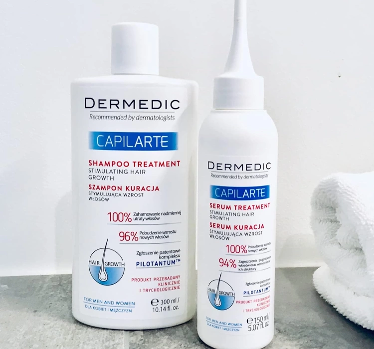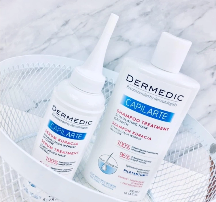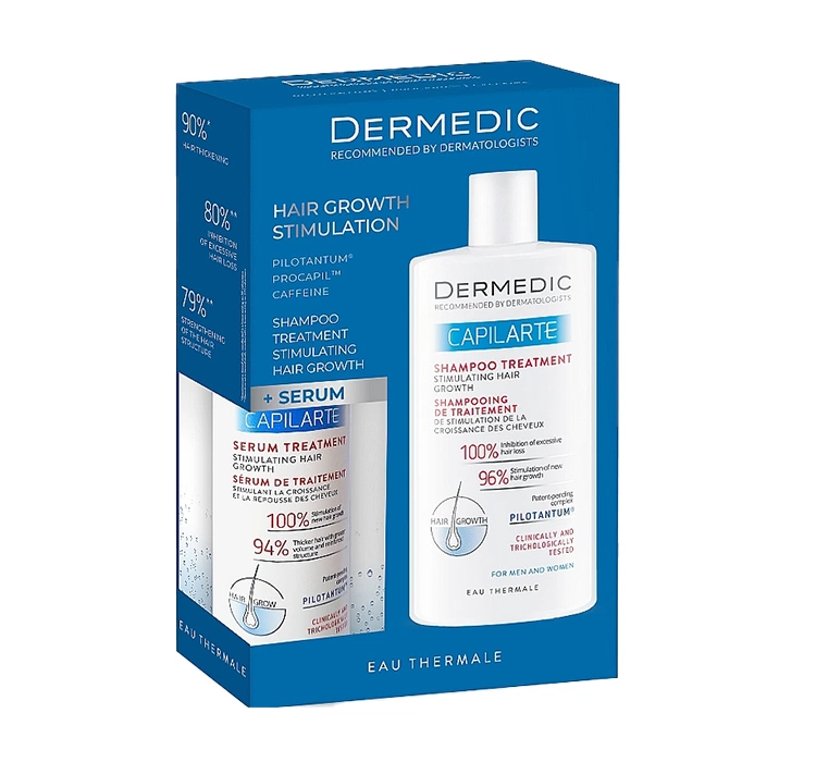 Шампунь для стимуляции роста волос от Dermedic Capilarte эффективно останавливает чрезмерное выпадение волос, делает волосы более густыми и ускоряет процесс его роста. Формула шампуня содержит специально подобранные активные ингредиенты, среди которых: Procapil, комплекс Pilotantum™ или кофеин, подавляющий выработку гормона дигидрокситестостерона (ДГТ), ответственного за выпадение волос. Сыворотка от Dermedic Capilarte, стимулирующая рост и восстановление волос, улучшает микроциркуляцию кожи головы, благодаря чему необходимое количество витаминов и питательных веществ поступает в клетки волосяного фолликула. Кроме того, сыворотка успокаивает раздражение кожи головы и восстанавливает правильные пропорции бактериальной микрофлоры головы. Продукт гипоаллергенный и трихологически протестированный.