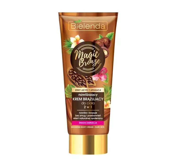 Серия Magic Bronze от Bielenda позволит Вам получить эффект естественного загара безопасным и простым способом. Продукты предназначены для различных типов кожи и позволяют достичь желаемого эффекта с одновременным уходом. Продукты созданы так, чтобы они не оставляли полос, обеспечивали простое применение с равномерным распределением загара.Увлажняющий крем для тела 2в1 от Bielenda из серии Magic Bronze обеспечивает великолепный загар уже после первого нанесения. Продукт предоставляет идеальный эффект без полос и пятен. Имеет увлажняющие, успокаивающие и питательные свойства - сглаживает кожу и придает ей бархатную мягкость. Приятный аромат какао-масла, простое применение и удивительный результат делают его идеальным косметическим средством для естественного загара.