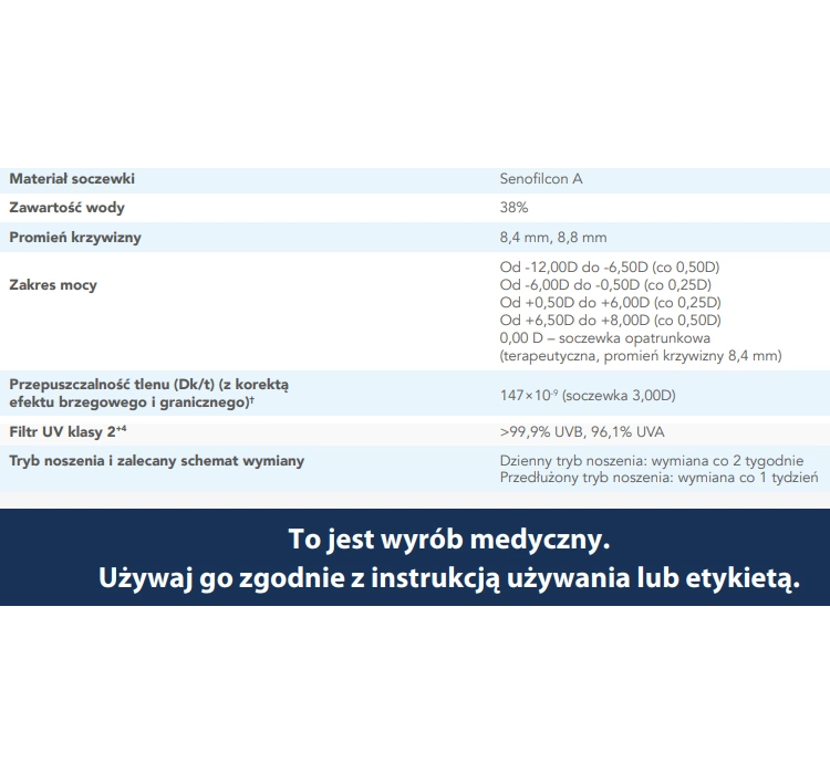 Контактні лінзи та розчини для їх догляду є медичними виробами, здебільшого класу IIa, відповідно до вимог Регламенту (ЄС) 2017/745 Європейського Парламенту і Ради (MDR), а також Закону від 7 квітня 2022 року про медичні вироби (Вісник законів 2022, поз. 974). Перед застосуванням рекомендується проконсультуватися з фахівцем з догляду за зором і дотримуватися вказівок в інструкції.