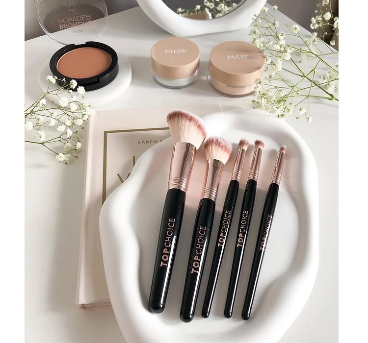 Пензлі Top Choice Golden Touch мають м’яку синтетичну гнучку щетину, яка ніжно ковзає по шкірі, забезпечуючи рівномірний розподіл косметики. Їх відповідна щільність означає, що як розсипчасті, так і кремові формули добре поєднуються, створюючи природний ефект без плям і смуг. Завдяки ретельно підібраній формі та розміру щетини кожна кисть виконує певну функцію, полегшуючи точне нанесення макіяжу.