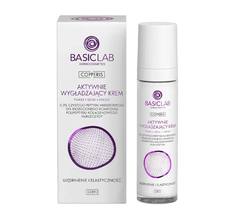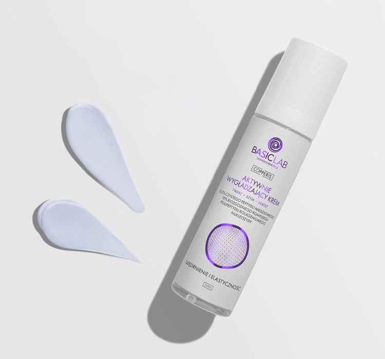 Секрет ефективності BasicLab Copperis Active Smoothing Face Cream полягає в унікальному поєднанні активних компонентів. 0,3% чистий мідний пептид інтенсивно стимулює вироблення колагену, еластину та глікозаміногліканів, підвищуючи пружність і щільність епідермісу. Він має регенерувальну дію та підтримує відновлення захисного бар’єра шкіри, що значно зменшує помітність зморшок. 10% біосумісний комплекс колагенового поліпептиду захищає колагенові волокна від деградації, підтримує природні процеси відновлення та покращує дермоепідермальне з’єднання, яке з віком слабшає. У складі також присутні нуклеозиди, такі як аденозин і уридин, що забезпечують належне зволоження, зменшують мікрозапалення та сприяють регенерації клітин. Інноваційне поєднання EGCG на пептидному носії підсилює антиоксидантну дію, підтримує процеси оновлення та зміцнює гідроліпідний бар’єр, запобігаючи втраті вологи й утворенню пігментних плям.