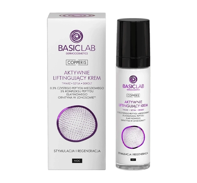 Активний ліфтинг-крем для обличчя BasicLab Copperis — це вдосконалена формула, створена для шкіри, яка потребує інтенсивного догляду. Концентрований комплекс активних інгредієнтів підтягує контур обличчя, покращує структуру та повертає молодий вигляд. Регулярне використання зменшує видимість зморшок і носогубних борозен, відновлюючи пружність і еластичність шкіри. Легка текстура, що добре вбирається, чудово вписується у вечірній ритуал догляду, підтримуючи процеси регенерації, які відбуваються у шкірі під час сну.