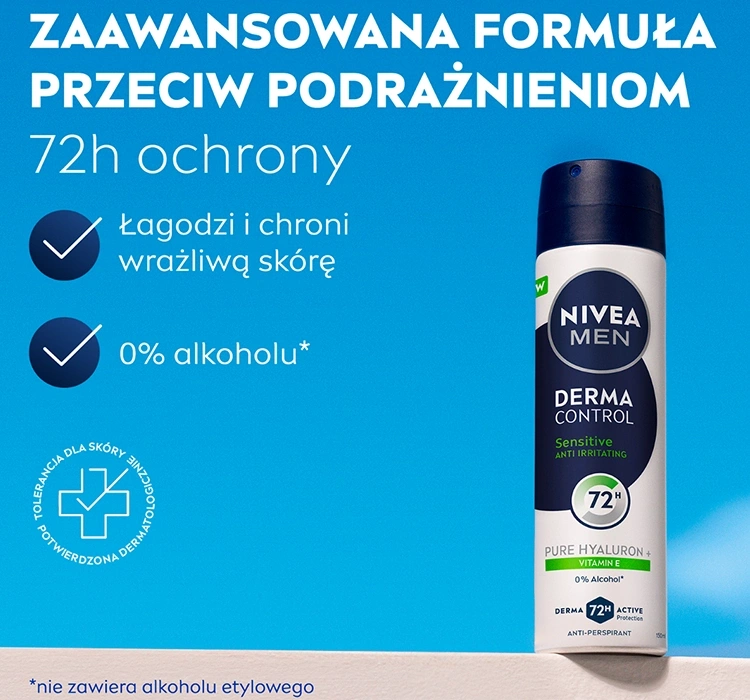 NIVEA MEN Derma Control Sensitive — антиперспірант у спреї, створений спеціально для чоловіків з чутливою шкірою, які очікують не лише ефективного захисту від поту, а й комплексного догляду. Забезпечує до 72 годин антиперспірантного захисту, що робить його ідеальним вибором для активних людей, тих, хто працює в складних умовах, або потребує тривалого відчуття свіжості. Його делікатна, але ефективна формула розроблена для комфорту й захисту щодня.