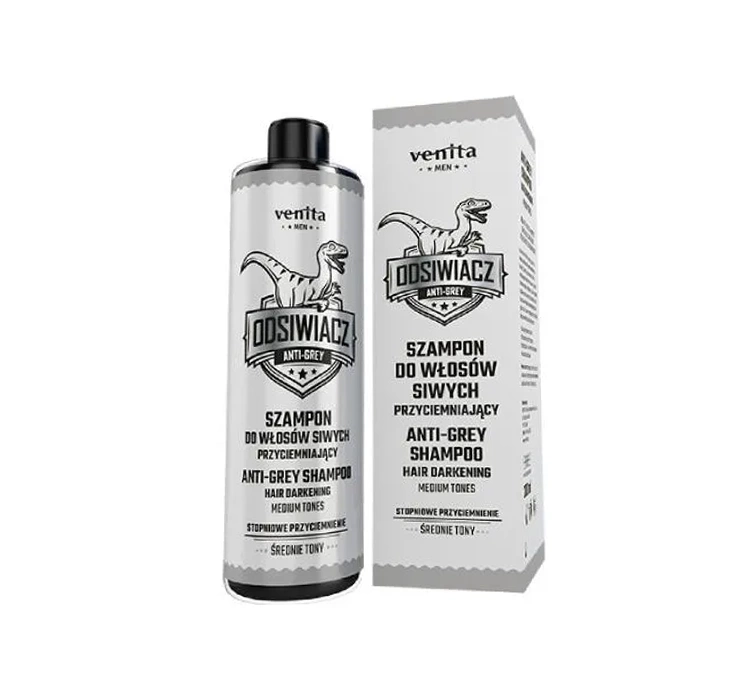 ПольщаШампунь для затемнення волосся Vanity Men Anti-Grey призначений для чоловіків, які хочуть приховати сивину. Косметичний засіб ефективно запобігає процесам посивіння волосся, природним чином поглиблюючи відтінок пасм і затемнюючи їх. Шампунь Vanity Men Anti-Grey збагачений корисними рослинними екстрактами волоського горіха, крамерії триандрової та мітлиці, які багаті фітопігментами. Шампунь призначений для затемнення каштанового і чорного волосся.