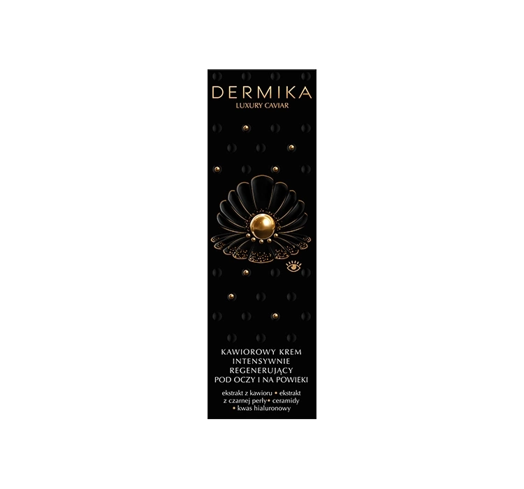 Екстракт ікри забезпечує шкіру цінними протеїнами, ліпідами та вітамінами, підтримуючи регенеративні процеси й нейтралізуючи вільні радикали, а екстракт чорної перлини заспокоює, зволожує та зміцнює структуру шкіри, зберігаючи її молоде сяйво. Комплекс церамідів відновлює ліпідний бар’єр шкіри, повертаючи комфорт і захищаючи від пересихання. Додатково крем для шкіри навколо очей і повік Dermika Luxury Caviar містить середньомолекулярну гіалуронову кислоту, яка інтенсивно зволожує та утримує вологу, а також масло ши та кокосову олію, що живлять і відновлюють делікатну шкіру навколо очей, покращуючи її еластичність і пружність.
