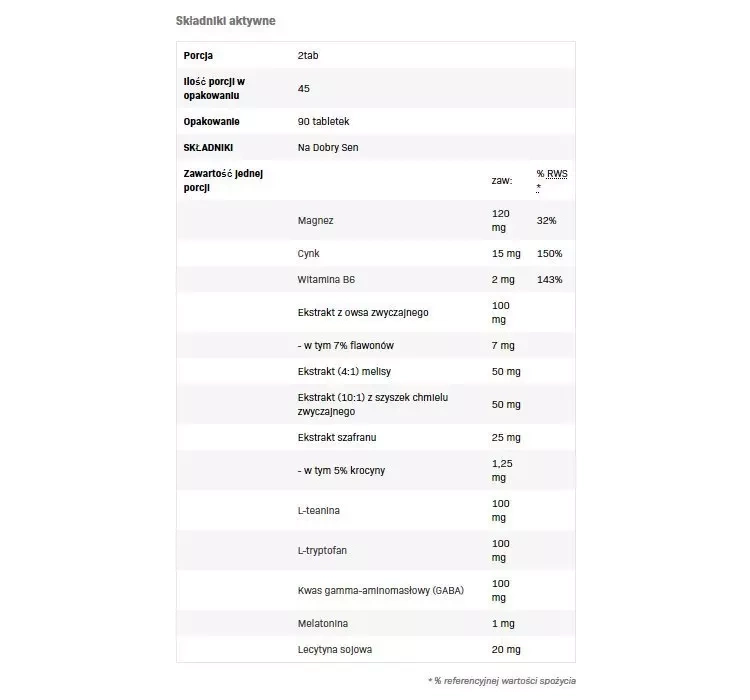 Добавка містить мелатонін, який допомагає скоротити час, необхідний для засипання. Екстракт хмелю та шафрану, які розслаблюють тіло, та екстракт вівса, що підтримує процеси детоксикації організму.
